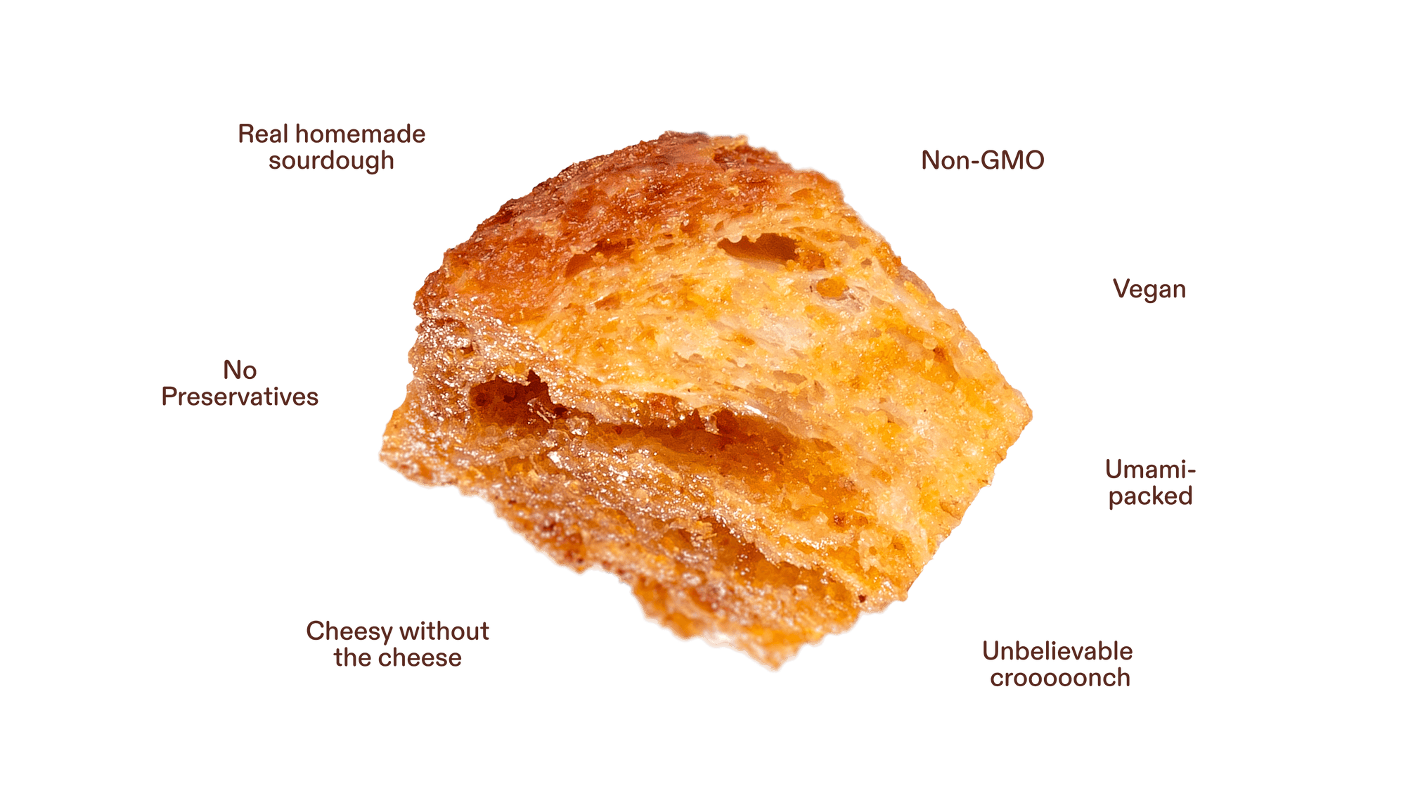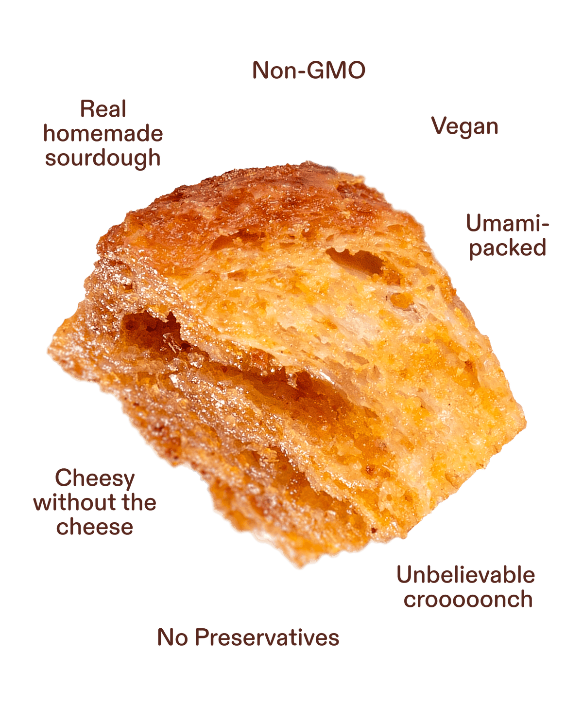 Made with just: Sourdough Bread, Extra Virgin Olive Oil, Nutritional Yeast, Garlic Powder, Salt. Contains Wheat.