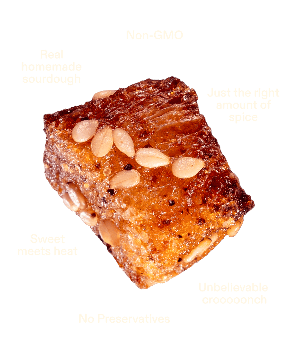 Made with just: Sourdough Bread, Honey, Extra Virgin Olive Oil, Sesame Seeds, Salt, Garlic Powder, Black Pepper, Cayenne Pepper. Contains Wheat and Sesame.